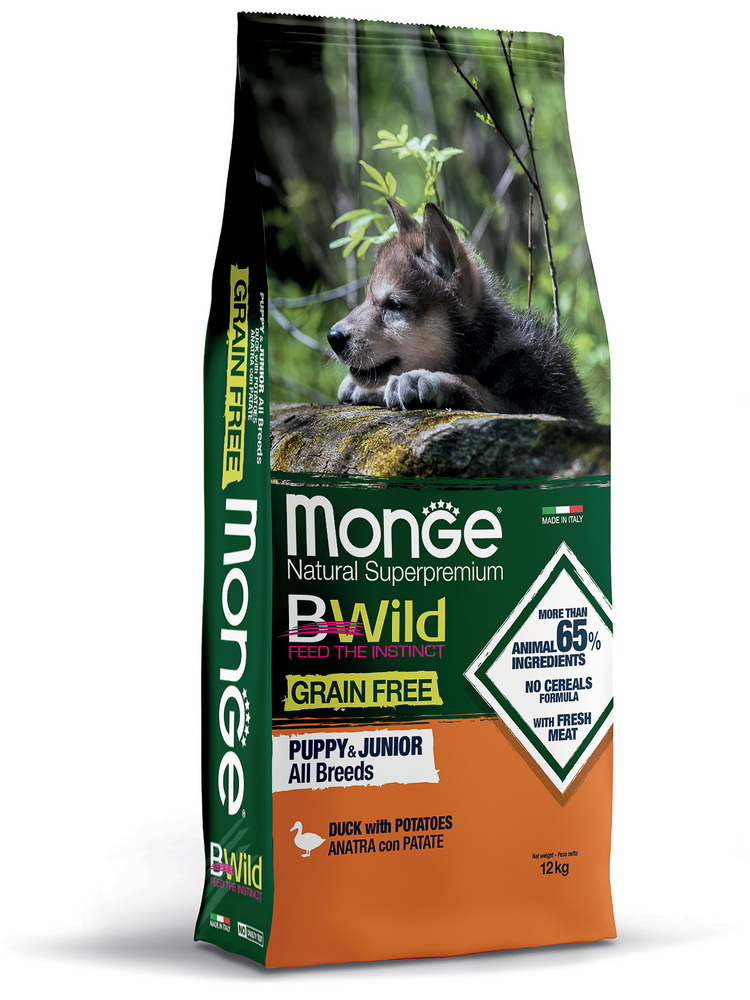 MONGE GRAIN FREE ALL BREEDS PUPPY CON ANATRA E PATATE — это полноценный сбалансированный беззерновой рацион для щенков всех пород, склонных к аллергической реакции на глютен, а также для молодых животных, ведущих активный образ жизни. Рацион является уникальным продуктом в линейке кормов Monge, поскольку только он создан на основе мяса утки, которое считается одним из наиболее ценных источников полноценного белка и витаминов группы B.