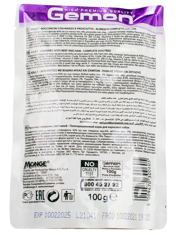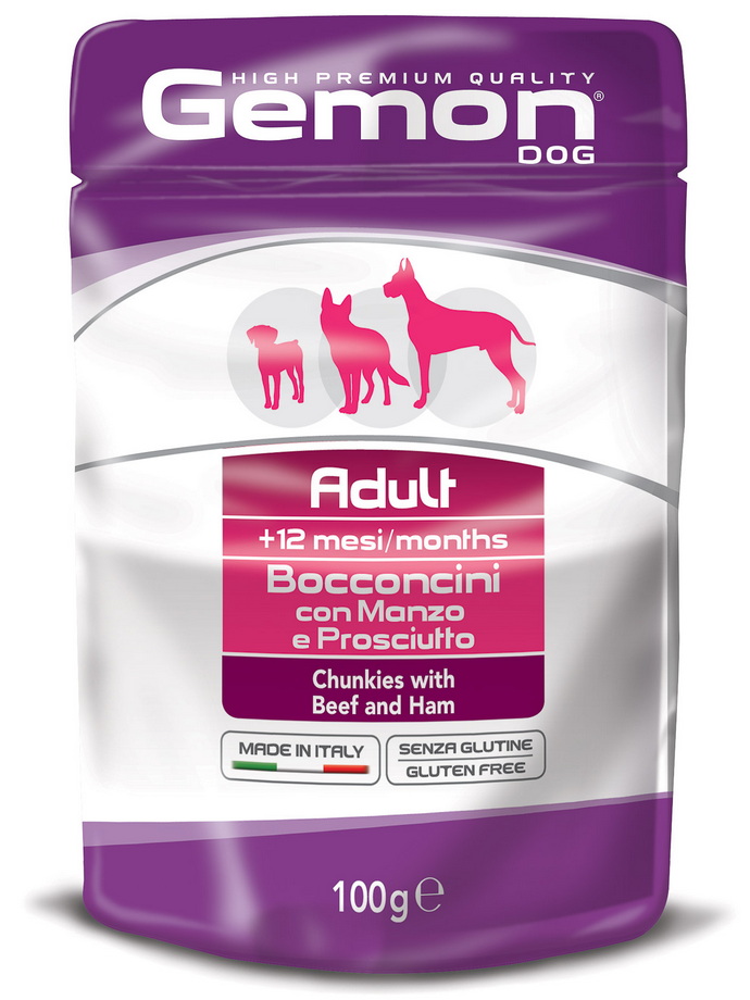 GEMON паучи для собак (кусочки говядины с ветчиной), 100 г