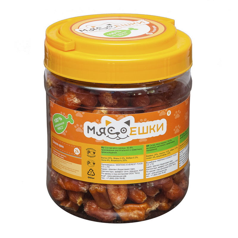 Специально для собак ТМ Мясоешки разработала Сосиски кроха, вкуснейшие лакомства из натурального мяса. Курятина в составе практически не содержит жиров и углеводов, поэтому ее калорийность в 2 раза меньше, чем у любого другого мяса. Съедая их собака получит заряд хорошего настроения и порцию дополнительной заботы от любящего хозяина. Сосиски кроха ТМ Мясоешки можно давать за успешное выполнение команд, демонстрацию прекрасного поведения или просто как дополнительный источник питательных веществ. Будьте уверены пес будет счастлив.