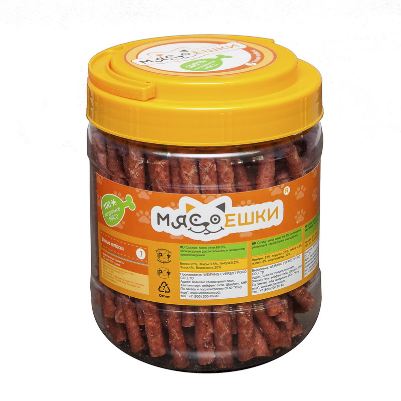 Утятина не зря считается полезным продуктом. Богатое протеинами мясо этой птицы укрепляет организм, насыщает его нужными веществами и заряжает энергией. Более того, мясо утки обеспечивает надежную защиту иммунитета. Рекомендуем включить в ежедневный рацион собаки утиные колбаски ТМ Мясоешки. Деликатес, перед которым не устоит ни один пес. В составе исключительно утиное мясо, при этом отсутствуют какие-либо консерванты и усилители вкуса. Утиные колбаски — это максимум пользы в каждом кусочке. Утиные колбаски можно взять с собой на прогулку или в дорогу, используя закуску в качестве поощрения питомца. Так рацион домашнего любимца будет максимально сбалансированным, а активность и жизнерадостность станут его постоянными спутниками, а экономичной упаковки хватит надолго.
