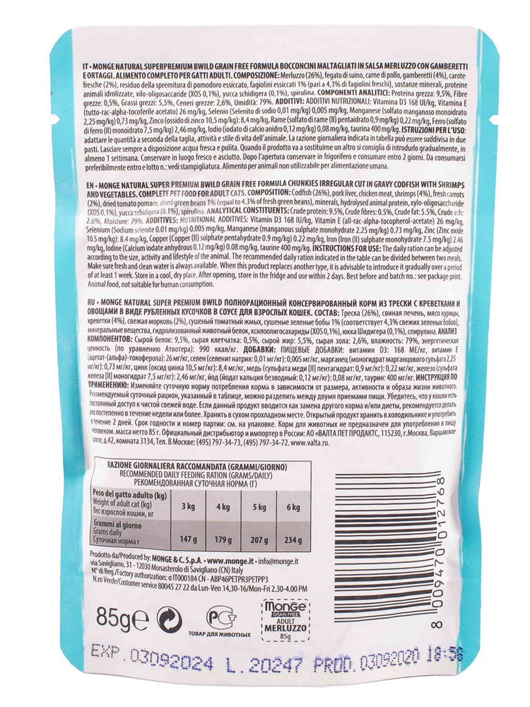 MONGE паучи для кошек Cat BWild (треска с креветками), 85 г